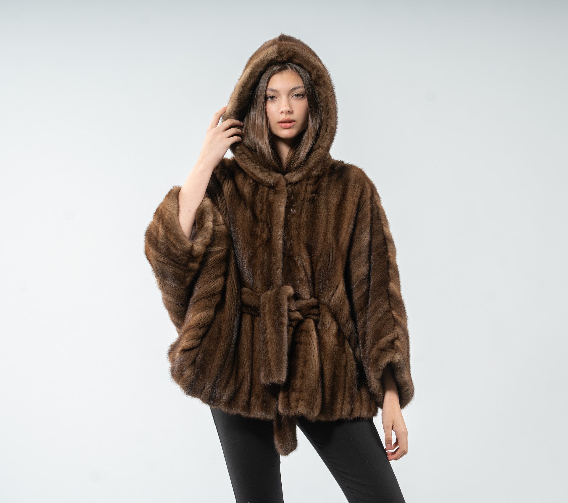 Accueil " Boutique " Manteaux de fourrure " Fourrure de vison " Cape à capuche en fourrure de vison Demi Buff